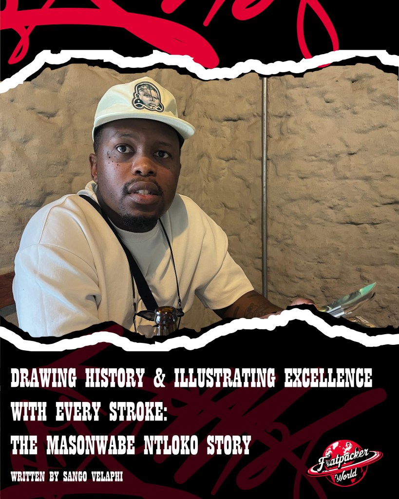 At the end of 2025 Masonwabe unveiled a capsule clothing collection and has released several limited editions print collection along the way. Through his multidisciplinary practice Masonwabe Ntloko continues to explore the intersection of culture, identity, and design establishing a body of work that is personal, innovative, and deeply rooted in the heritage of his upbringing. Masonwabe has also showcase in group exhibition with galleries such as Origin Art Gallery, BNAP Foundation, World Art Gallery, he has also shown some of his work at the Latitudes Art Fair 2025, with some of his work currently in the University of Pretoria Museums. Masonwabe has also had an opportunity to showcase some of his work in Brussels with Limani Gallery at the Belfius Bank. Masonwabe works in mediums: digitally (for designing), fine liner and acrylic on paper for paintings but we now that we have the canvas that is Masonwabe Ntloko, I’ll be the brush as he paints the self-portrait of his background.